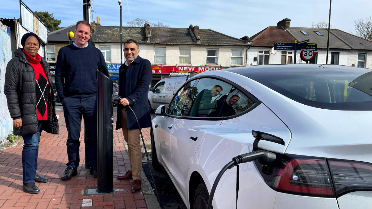 Pictured: Councillor Muhammad Ali, cabinet member for sustainable Croydon, Councillor Patsy Cummings, deputy cabinet member for sustainable Croydon, and Shayne Rees char.gy Marketing Manager at the new char.gy charge point at Norwood Junction station, a site specifically requested by local residents and cab drivers.